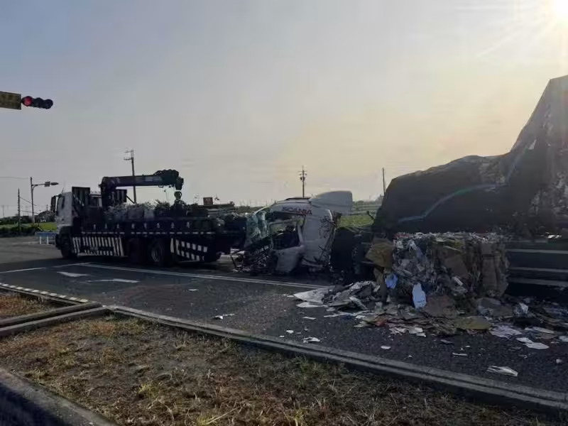 彰化聯結車猛撞停等紅燈大貨車! 車頭噴飛、駕駛受困救出