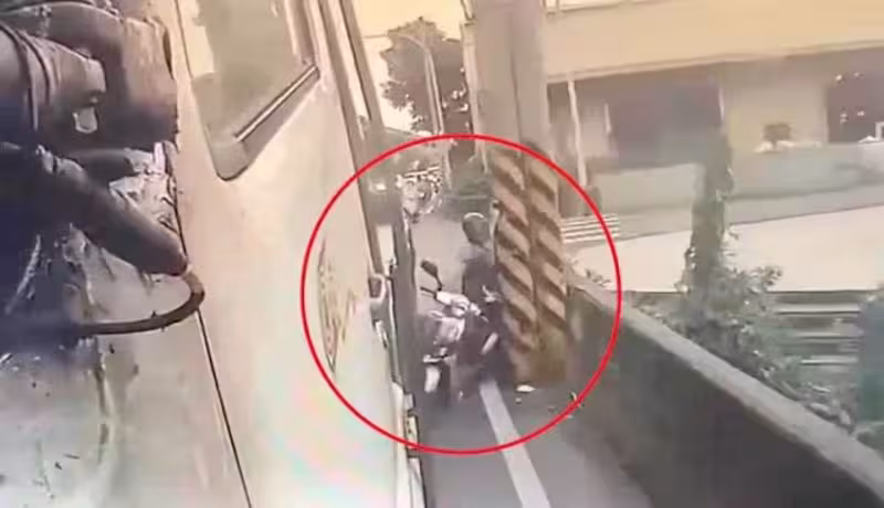 大貨車原本開在左邊車道,後方還有好幾台機車,大貨車卻愈開愈往路邊靠近,通過一處巷口後,幾乎緊貼著同向這名機車騎士。騎士疑似無處可閃,被一旁護欄和大貨車夾擊,朝前方電線桿撞上去,反彈之後又和大貨車發生擦撞,連人帶車噴飛倒地,差點就被大貨車輾過,相當驚悚。