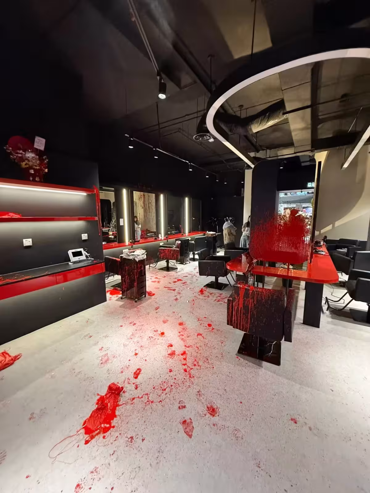 他說,起初以為是送貨員或理髮院業者或員工的朋友,但下一秒就看見有人開始拋擲紅漆,大家馬上跑開尋找遮擋物。