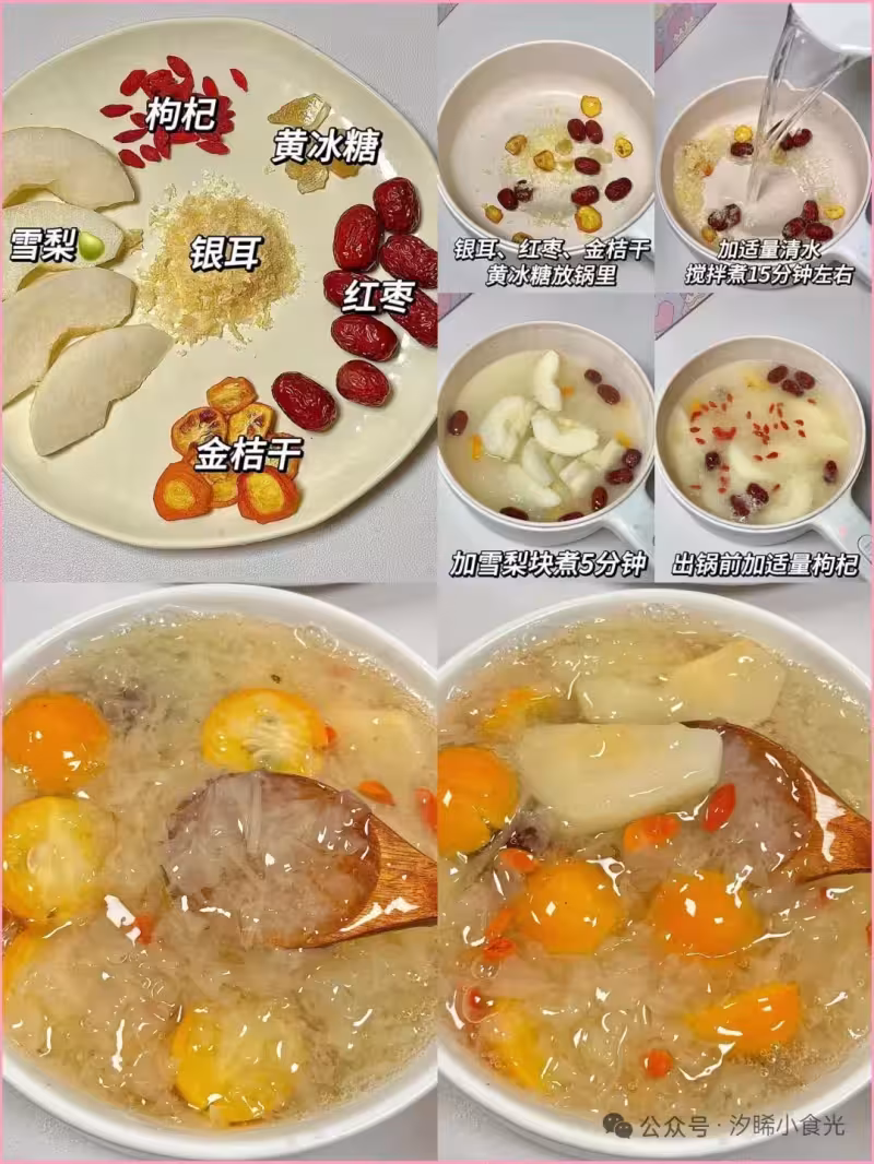 食材:枸杞、黃冰糖、雪梨、銀耳、紅棗、金桔干