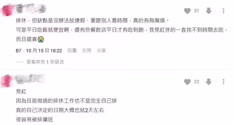 文章出後,許多兩種休假都做過的網友表示「做過排休跟見紅休,比較喜歡見紅休,排休的工作很多都會坑假或坑薪,明明該給雙倍薪水卻都沒給」、「不喜歡排休有時候遇到特殊狀況要連上很多天,或是好不容易休假了,結果只有排一天」。還有許多喜歡「見紅休」的網友認為,根據國定假日放假家人、朋友之間要約出去比較好喬時間,也不會經常因為要上班拒絕聚餐、旅遊邀請感到尷尬。還有網友指出「排休很容易跟同事卡假」、「目前做過的排休工作也不是完全自己排」。不過也有偏向「排休制」的網友表示「我個人超級愛排休,我周休二日排休,都排平日我出門都一路順暢」、「排休出去玩或出國都超便宜還不用人擠人」。