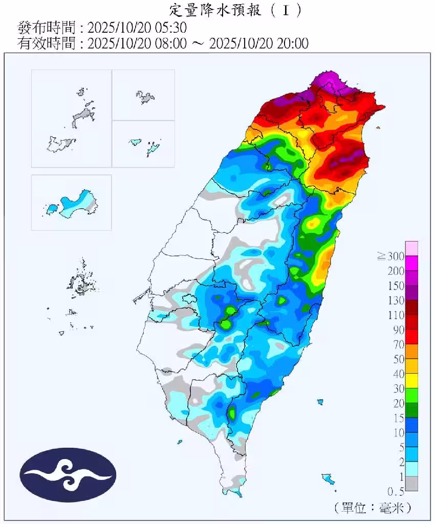 氣象署也發布「陸上強風特報」,東北風明顯偏強及颱風外圍環流影響,今晨至周二晚上,苗栗縣、台中市、彰化縣、雲林縣、澎湖縣、連江縣局部地區有平均風9級以上,或陣風11級以上發生的機率;基隆市、台北市、新北市、桃園市、新竹市、新竹縣、嘉義縣、台南市、高雄市、屏東縣、宜蘭縣、台東縣(含蘭嶼、綠島)、金門縣局部地區有平均風6級以上,或陣風8級以上發生的機率。