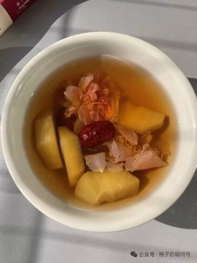 酸酸甜甜的,蘋果和玫瑰花搭配很特別,身體暖著,心情也跟著好。桂圓、紅棗補氣血,秋天喝很合適,女生喝更漂亮。