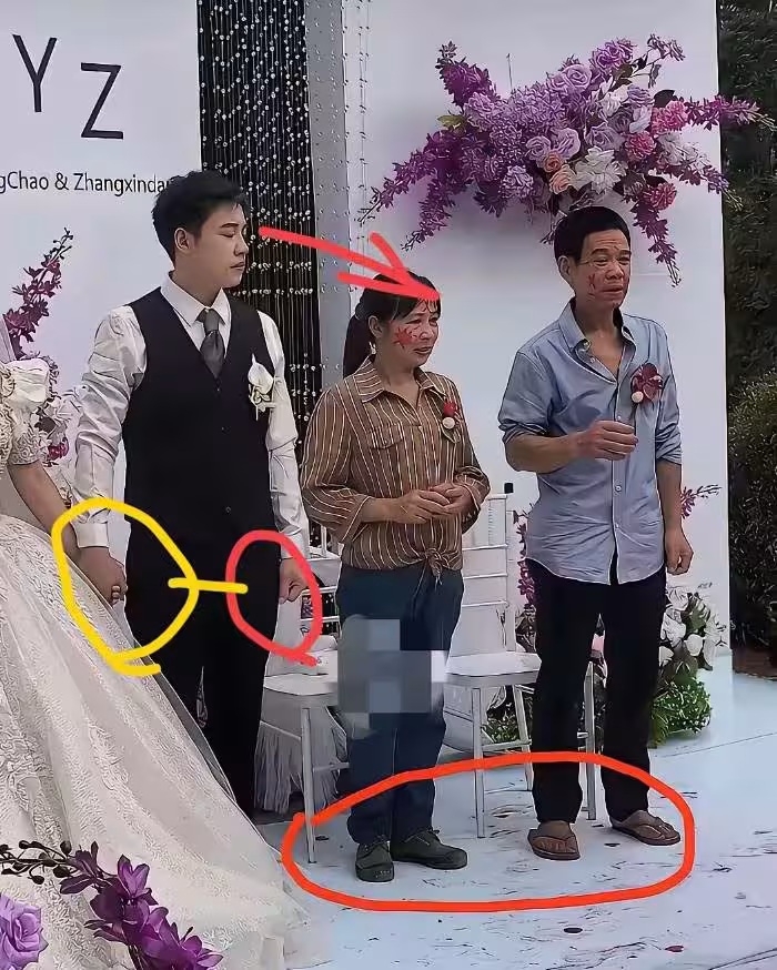 這張本該充滿喜悅的合影,因為父母腳上那雙破舊的鞋子和不合時宜的穿著,確實讓人感到一種複雜的刺痛和深深的無奈。