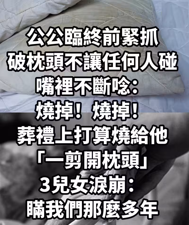 公公臨終前「緊抓破枕頭不讓任何人碰」嘴裡不斷念:燒掉!燒掉! 葬禮上打算燒給他「一剪開枕頭」3兒女淚崩:瞞我們那麼多年~