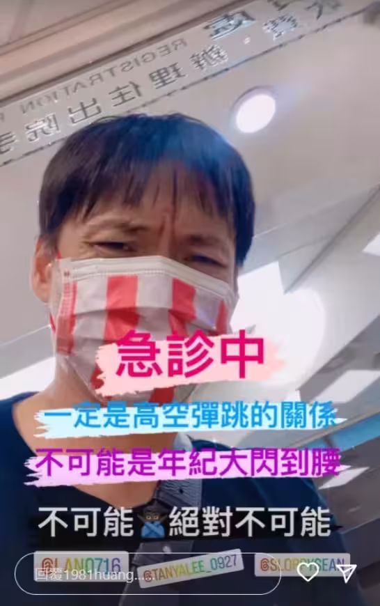 他PO出在挂號櫃檯前的自拍以及身穿並扶牆走路的畫面,表情相當痛苦不太舒服,提及病因,他才搞笑表示「天啊 我這輩子從來沒有腰痛過,這一定是從17樓跳下來的後遺症,不可能是年紀大了閃到腰吧,不可能!絕對不可能!咬著牙,排練完就去急診了」。