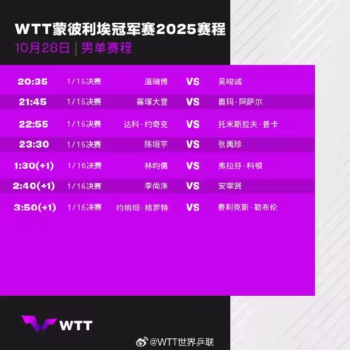 WTT倫敦球星挑戰賽結束後,蒙彼利埃冠軍賽接棒進行。首個比賽日,陳幸同、溫瑞博、陳垣宇三名中國選手出戰,具體對陣為:陳幸同VS斯佐科斯、溫瑞博VS吳晙誠、陳垣宇VS張禹珍,期待他們的好消息!