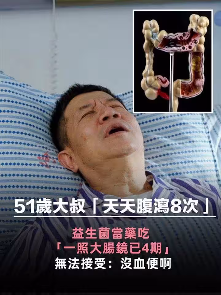 50歲大叔「天天腹瀉8次」以為腸躁症「一照大腸鏡已4期」益生菌當藥吃,無法接受:沒血便啊!!