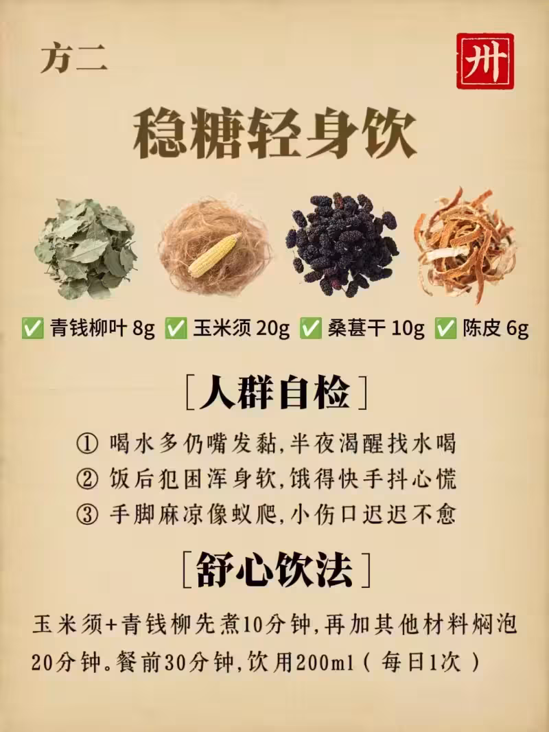 玉米須+青錢柳先煮10分鐘,再加其他材料燜泡20分鐘。餐前30分鐘飲用200ml(每日1次)