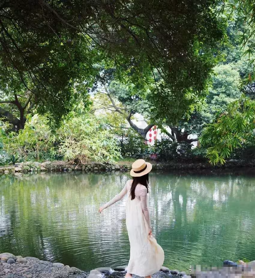三個人正拍的起勁的時候,穿藍色漢服的女遊客光顧著擺造型了,一下子踩空了,毫無防備的情況下掉進水裡了。