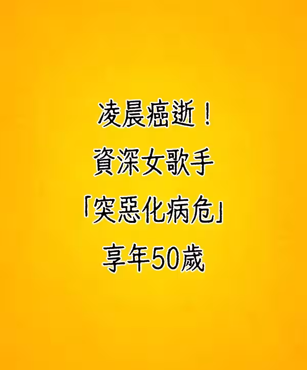 凌晨癌逝!!資深女歌手「突惡化病危」享年50歲