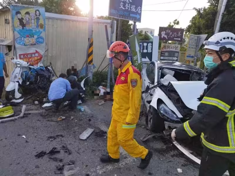 強大的撞擊力造成騎機車的33歲蔡姓男子和後坐妻子雙腳開放性骨折,機車上2名分別6歲和7歲的女兒受傷,駕駛特斯拉的李姓男子受困車內,被救出來時已經沒有生命跡象,經送醫搶救仍宣告不治,車上29歲的妻子和2名4歲的雙胞胎兒女受傷。