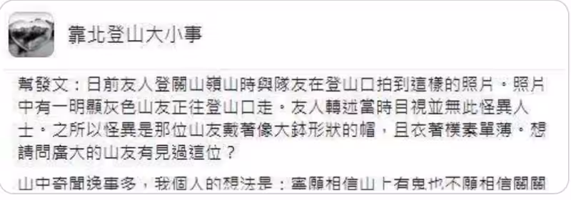 更讓人起雞皮疙瘩的是,朋友直言當下根本沒看到這個人影,現場完全沒有這號人物。原PO瞬間心裡發寒,懷疑是不是遇到靈異事件,緊張地發文求助:「廣大的山友,有人見過這位嗎?」