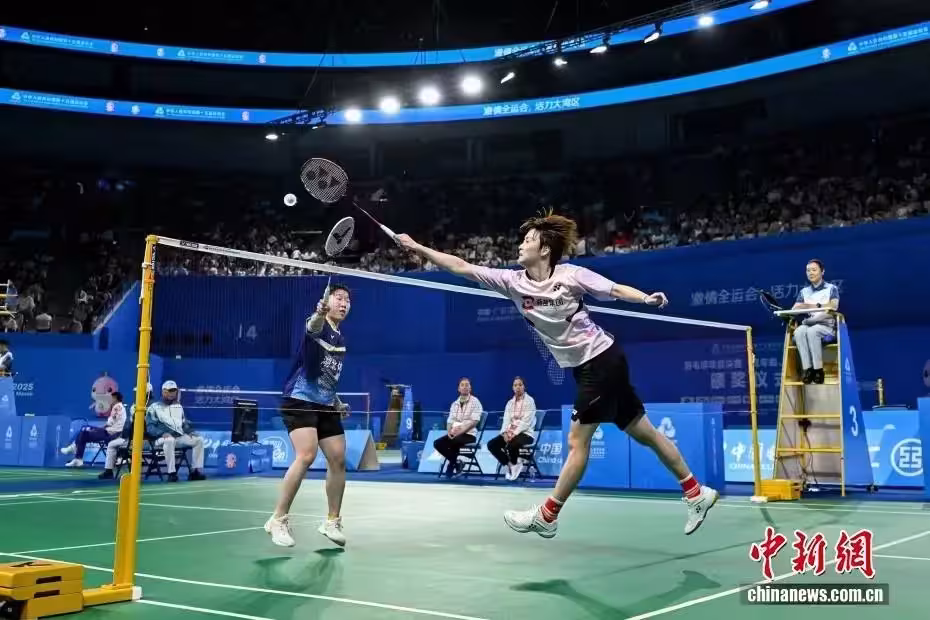 11月9日,第十五屆全國運動會羽毛球女子團體小組賽E組比賽在深圳市體育中心體育館舉行,奧運冠軍、浙江隊運動員陳雨菲2比0戰勝湖北隊運動員阮欣悅。圖為陳雨菲(右)在比賽中。中新社記者 韋亮 攝