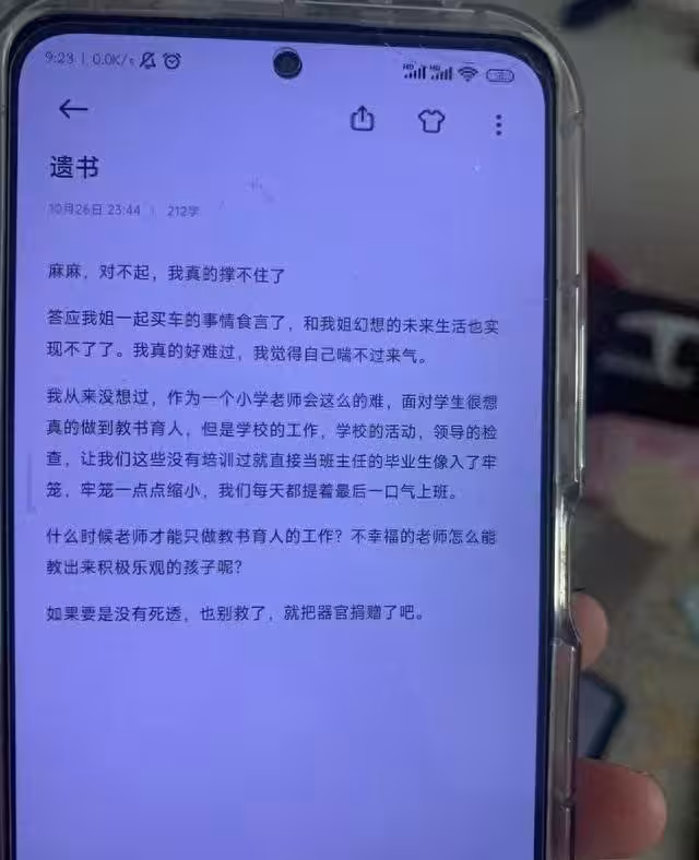 呂女的姐姐事後取回妹妹手機,發現對方留有一封遺書,內容不僅抱怨工作太忙、超時工作,還遭到學校長官責備、刁難,「從來沒想過,作為一個小學老師會這麼的難」、「學校的工作、學校的活動、長官的檢查,讓我們這些沒有培訓過就直接當導師的畢業生,像入了牢籠」,還絕望喊道「真的撐不住了」、「好難過,我覺得自己喘不過來氣」、「如果沒有死透,也別救了,就把器官捐贈了吧」。