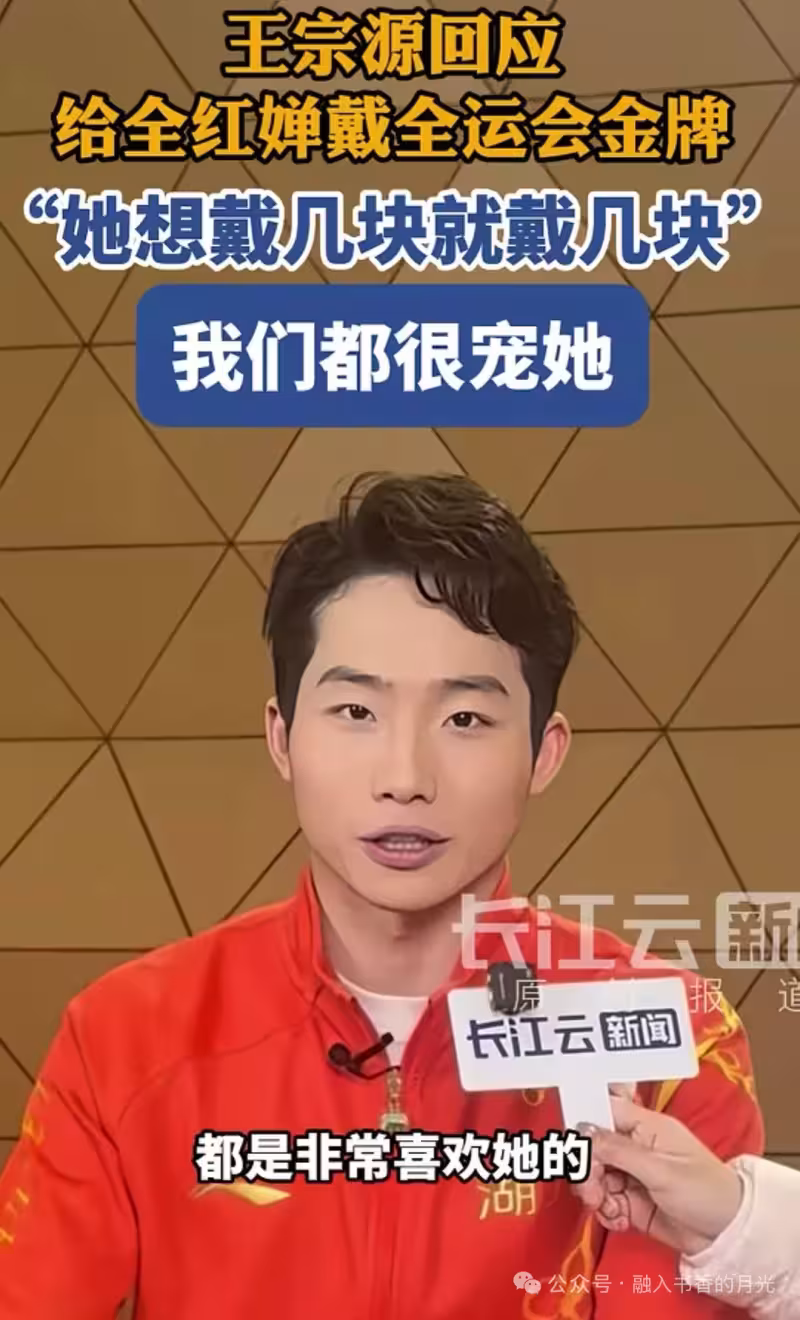 11月17日,湖北跳水王宗源走進湖北廣電傳媒大廈,體驗湖北新聞演播廳。在回應為什麼金牌自己不戴反而給全紅嬋戴上的問題,他的回答非常純粹並且率真誠懇,「因為她說,她想要戴一下」,那當然是沒有問題,「你想戴幾塊就戴幾塊!」因為我們都很寵她,都跟廣大網友一樣,都很喜歡她!