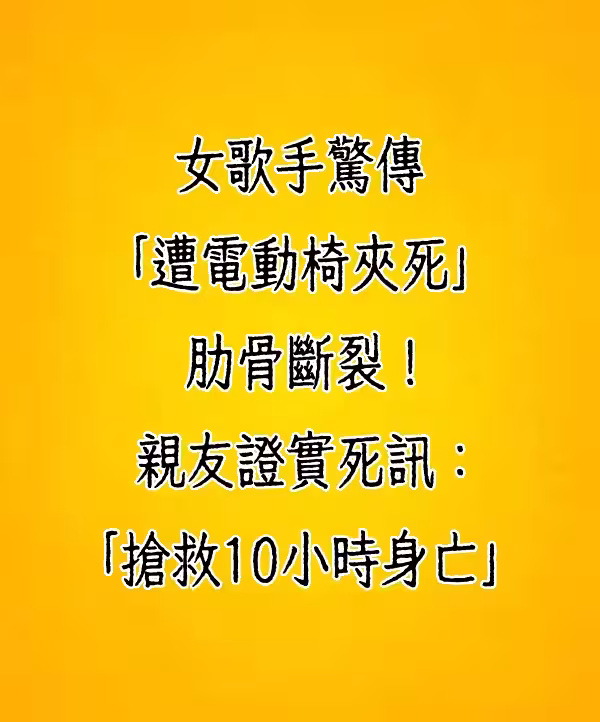 女歌手驚傳「遭電動椅夾死」肋骨斷裂!親友證實死訊:「搶救10小時身亡!」