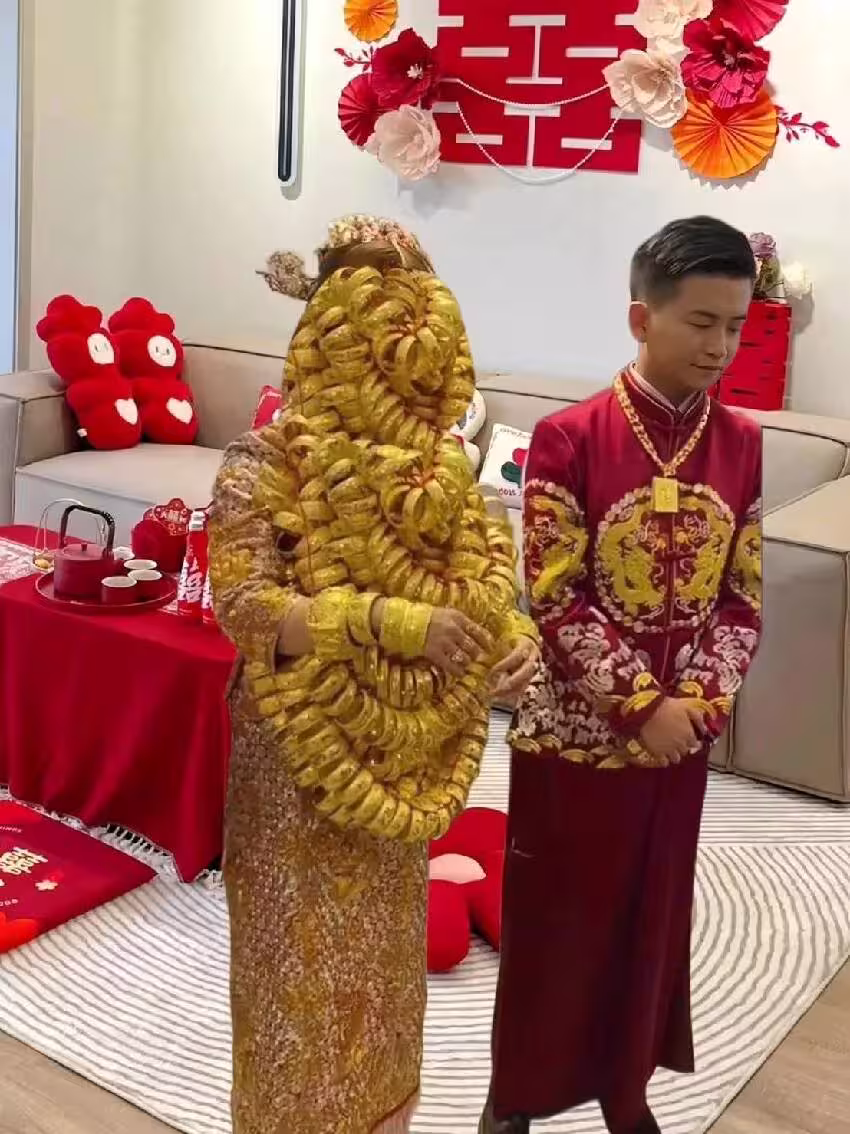 不過後來有人出來表示這個畫面是假的,原來是有人惡搞亂P圖,真正的新娘雖然也是在脖子上掛滿金項鍊和金手鐲,但其實人家的臉有露出來啦~