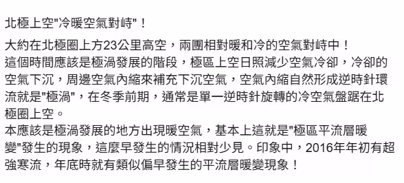 他進一步表示,冬季初期通常會有單一的冷空氣團以逆時針方式盤旋在北極圈高空,然而現在極渦應該發展的區域卻出現了暖空氣團,這基本上就是「極區平流層暖變」的跡象。