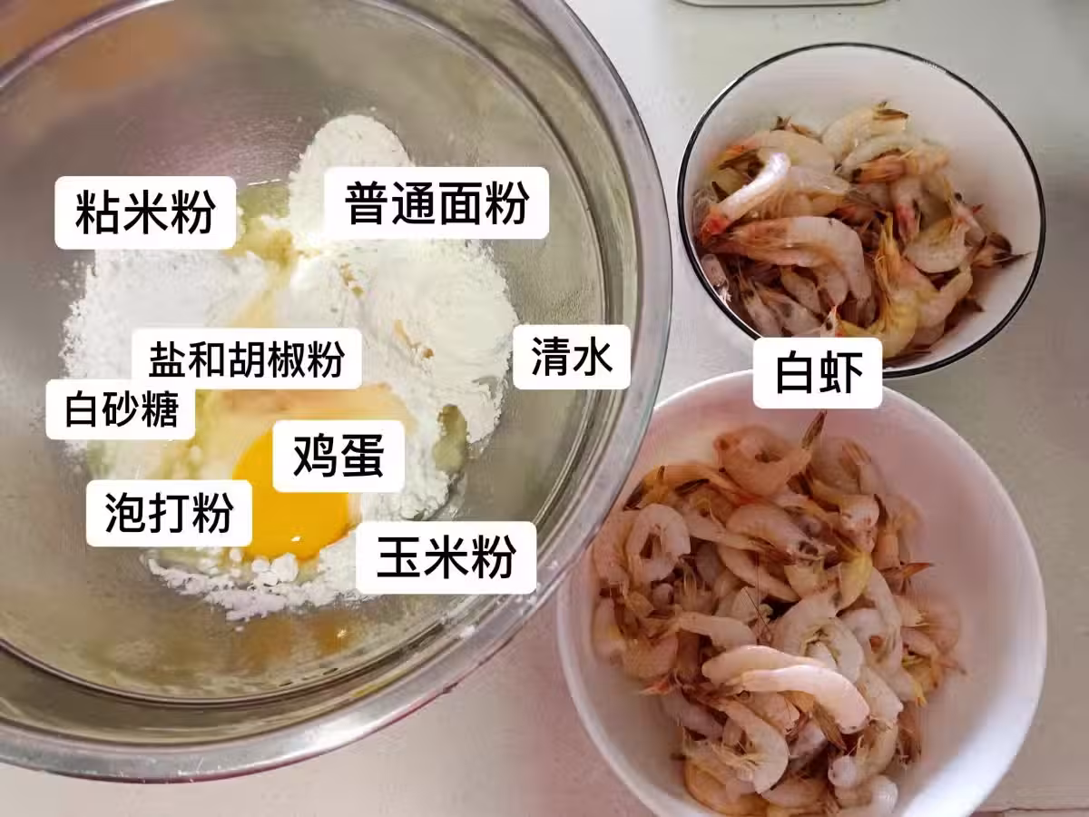 -把去頭的小白蝦放進去麵糊攪拌均勻,備用