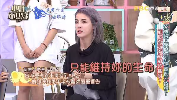 再加上當時面臨媽媽生病、爸爸不在身邊,徐小可在學校和醫院之間奔波,自立自強還獨自照顧弟弟,醫生在抽血時曾警告她:「你現在的體重,只能維持你的生命。」指出她現在的狀況已經有點像「厭食症」了,這才讓她驚醒,可能是減肥過程中遇到家中變故,壓力不知不覺進入,可能罹患憂鬱症的機率較高,進而影響食慾,就醫後雖然有試著增加食量,但吃不下也吸收不了,情緒影響體重還是上不去。