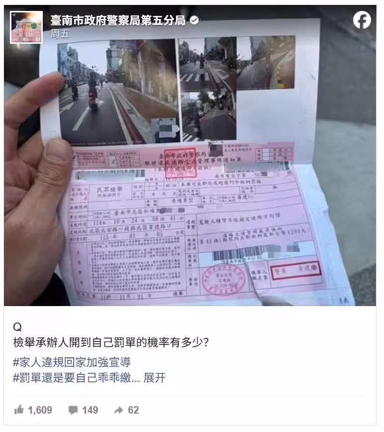 台南市政府警察局第五分局日前曬出一張罰單照片,並苦笑問道「檢舉承辦人開到自己罰單的機率有多少?」這張罰單是依據民眾提供的影像證據,經查證後成立的違規案件;