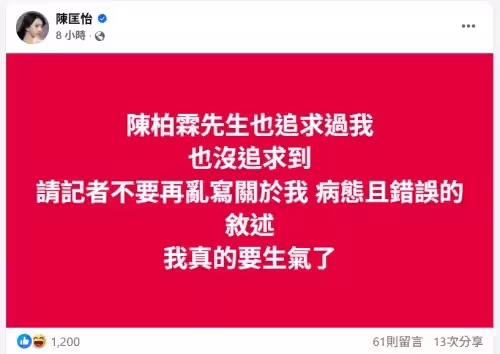 陳匡怡今日凌晨12點多突然在臉書以紅底白字的形式發文,她寫道:「陳柏霖先生也追求過我,也沒追求到。請記者不要再亂寫關於我病態且錯誤的敘述,我真的要生氣了」。