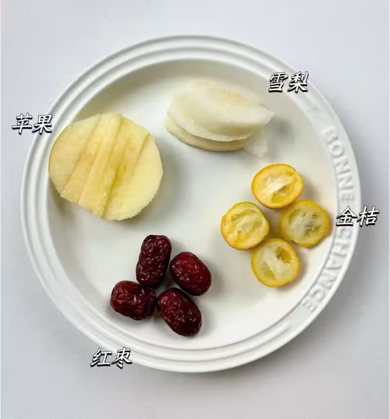 2️⃣、把處理好的蘋果塊、雪梨塊、金桔和紅棗一起放進鍋里;
