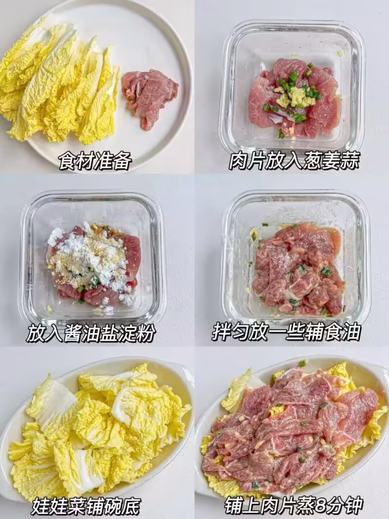 2. 娃娃菜切塊鋪底,上面鋪肉片,水開上鍋,大火蒸8分鐘即可。