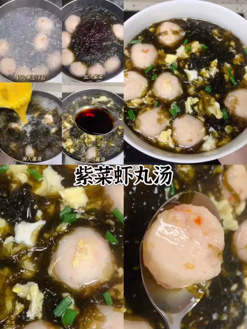 蝦仁剁成泥,加點澱粉攪勻,煮到浮起來後放紫菜、淋蛋液、一勺生抽、撒蔥花~