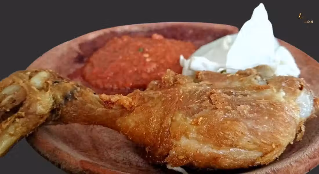 食材: 雞腿4個,孜然2大匙,芫荽籽2大匙,白鬍椒粒1大匙,香茅4根,鹽3茶匙 薑黃醬: 南薑50克薑黃50克,老薑50克,紅蔥頭100克,紅洋蔥100克,蒜頭50克 酸辣蘸醬: 辣椒50克,番茄100克,小辣椒25克,紅洋蔥100克,糖5茶匙,鹽1茶匙