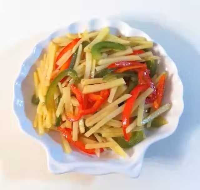 材料:土豆1個、青椒、紅椒各1個,大蒜、生抽、油、鹽做法:1、土豆切絲、青紅椒切絲、大蒜切片。2、土豆絲過水洗掉澱粉。3、鍋中加油,放入蒜片爆香。4、加入土豆絲翻炒。5、再依次加入適量的生抽、鹽再翻炒。6、快出鍋前加入青、紅椒絲翻炒即可出鍋