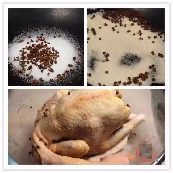 2、接著起鍋,鍋中不放油也不放水,而是直接往裡倒入50克的食用鹽,以及一把花椒,開小火進行翻炒,大概炒至鹽微微發黃,花椒出香味時,關火晾涼備用。