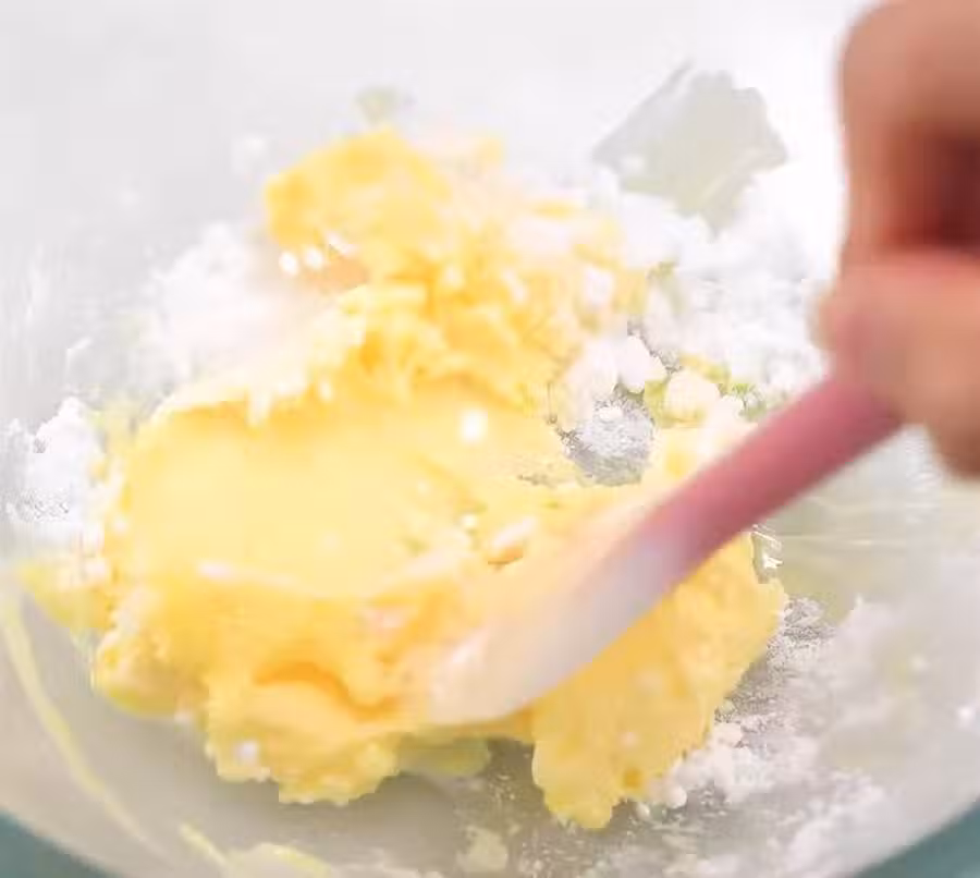 加入30g糖粉,先用刮刀將糖粉與黃油拌勻。