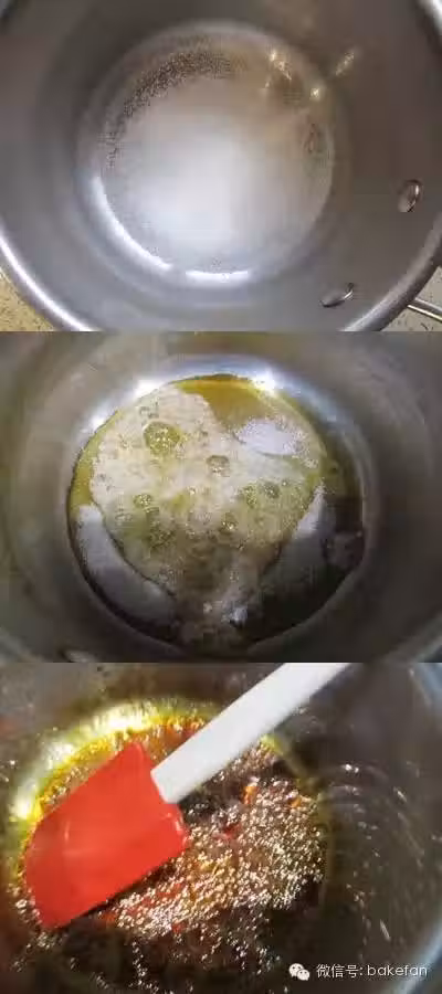 將焦糖液,倒入固定底的模具底部,搖晃下,使之布滿均勻。冷卻後是比較粘稠的一層,不流動