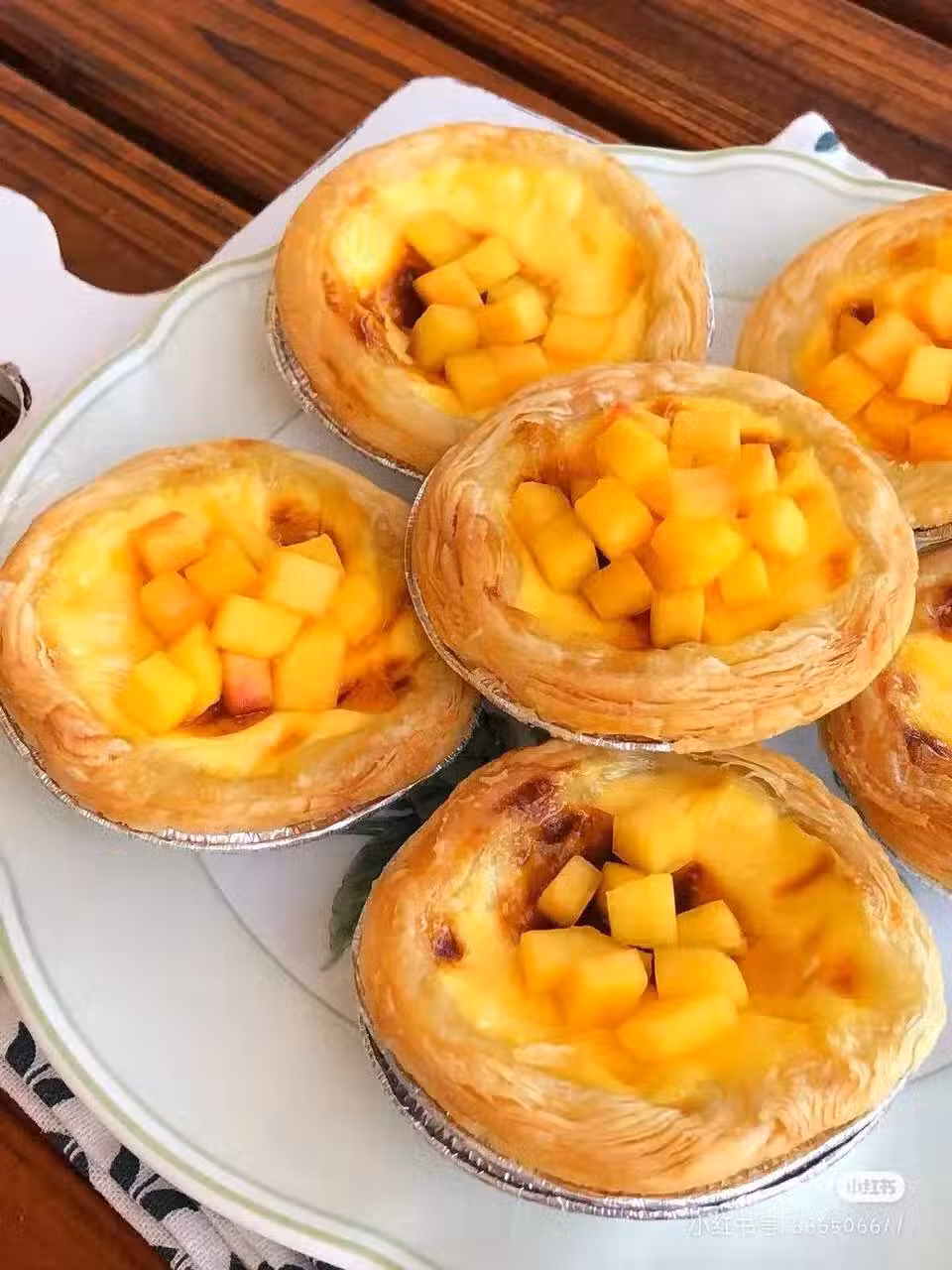 1.雞蛋中+牛奶+細砂糖攪拌均勻過篩兩遍,倒入蛋撻皮七分滿,放入烤箱210攝氏度烘烤25分鐘,晾涼至溫熱