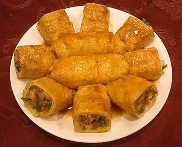3、每一塊豆包展開,將1份餡料包捲,至於盤內蒸熟。