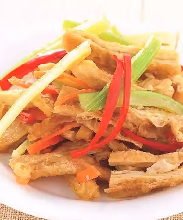 1、豆包洗淨;紅蘿蔔洗淨去皮;黑木耳洗淨去蒂;青椒洗淨去蒂及籽;均切成絲備用。