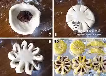 8、壓扁,用刀在周圍切幾刀,注意,不要切到圓心;