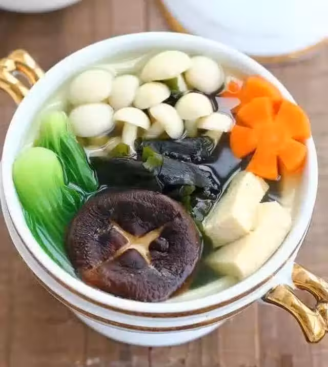 材料:裙帶菜,白蘑菇,胡蘿蔔,油菜,香菇,豆腐,素高湯