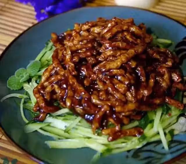 材料:素肉絲一小碗,黃瓜一條,水澱粉適量,甜麵醬小半碗,油,糖適量,鹽少許(可不放)