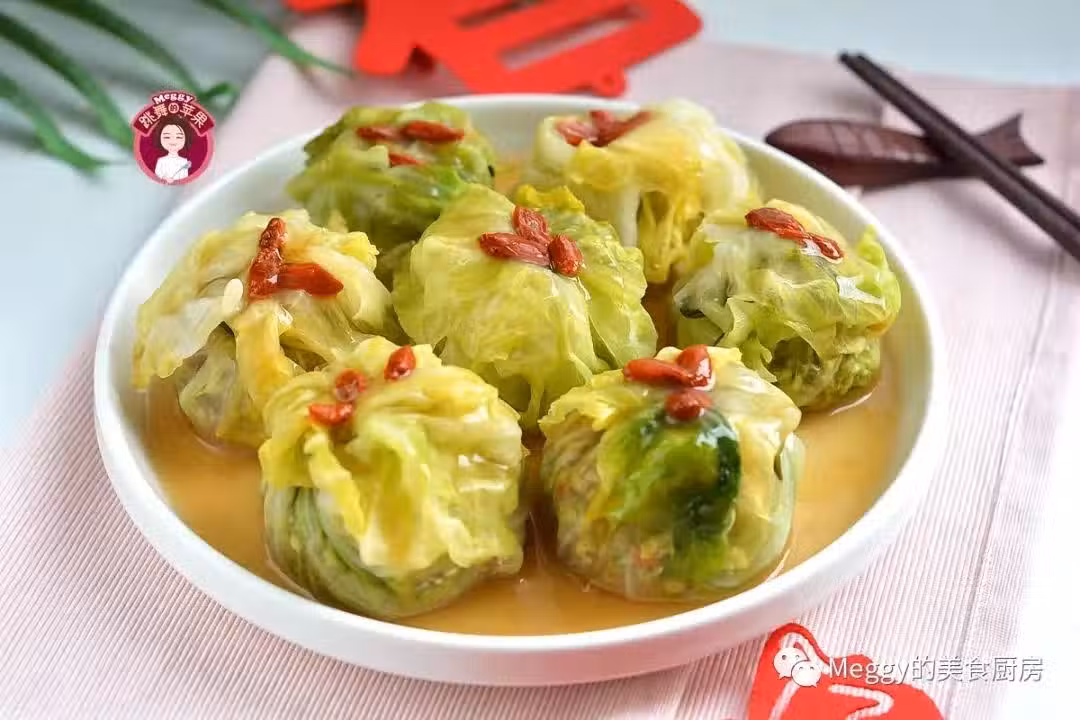 4. 菜葉切掉粗大的硬梗,放適量餡料,四周向中間聚攏,用青蒜葉繫緊;