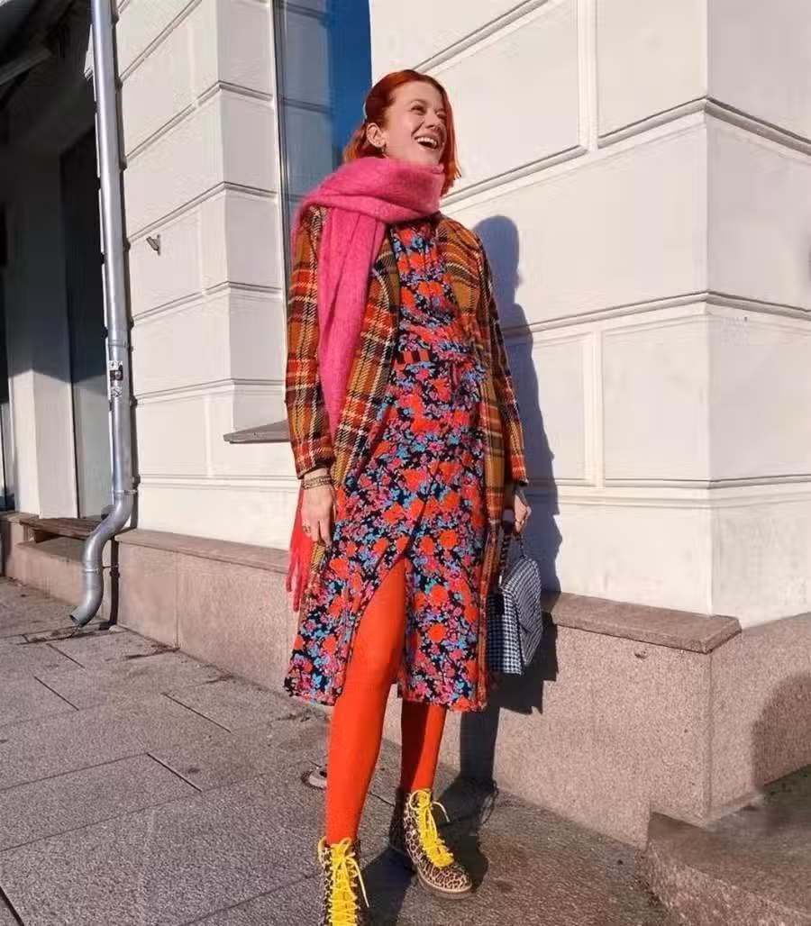 如圖中模特紅色花朵圖案連衣裙搭配紅色絲襪,外套也用了雜色,如同番茄炒蛋加紅蘿卜又加洋蔥整體談不上美觀;關於五彩斑斕的帶波點的不帶波點的絲襪千萬也是不要穿,搞不好就俗氣。 避雷2:亮黃色