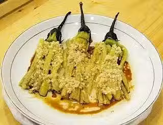 3、蒸盤上擺好茄子條,將炒好的湯汁澆上去,再放入蒸籠蒸五分鐘左右。