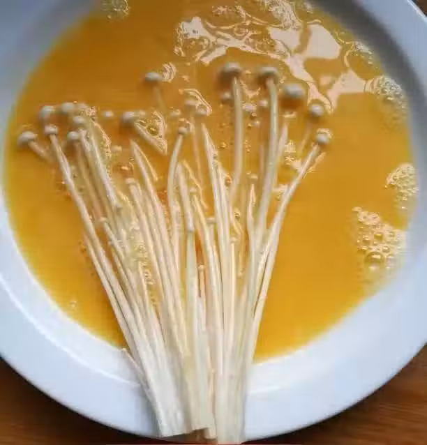 第二步、金針菇沾上一層雞蛋液,翻一翻沾均勻。
