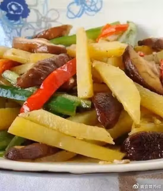 1、土豆切成略粗的條(比較易熟,而且香),香菇切成薄片,青紅椒切成絲。