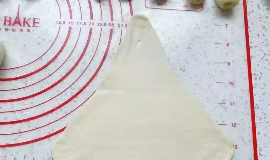 9、把面片翻面,從一邊的側面開始捲起,收口朝下放置,全部卷好,鬆弛10分鐘。