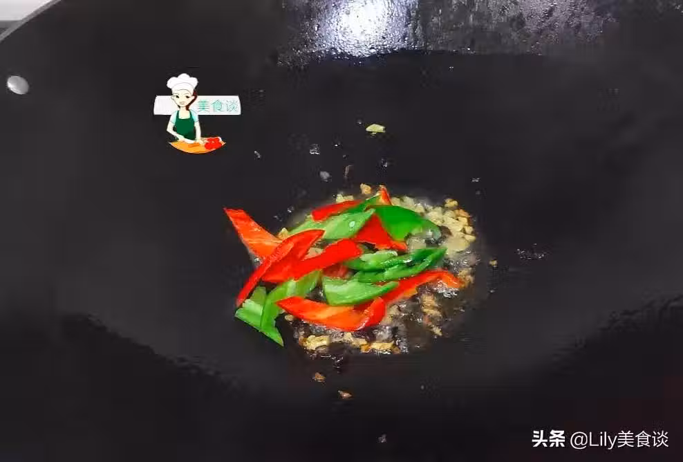 4、熱鍋涼油,下入薑蓉和豆豉下鍋煸炒出香味來,再下入少許的青紅椒絲一起炒香。