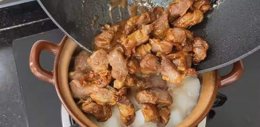 第八步:蘿卜煲了有10分鐘了,現在先用筷子給它攪動一下,防止它粘底,攪動好後鋪平,然後再倒入我們炒好的隔山肉,把隔山肉也鋪平。