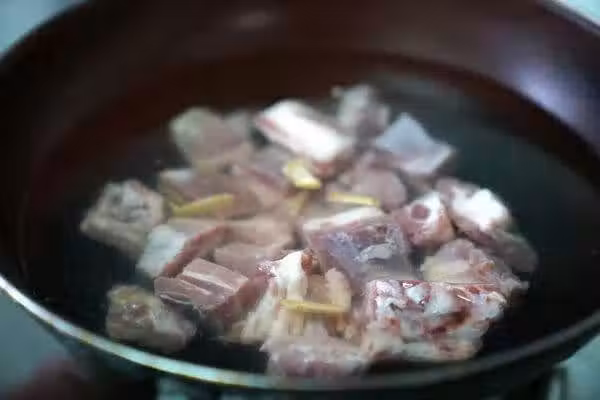 2.炒鍋中加入適量的冷水,沖洗好的排骨放進去。然後再放入幾個薑片、大蔥片不用蓋蓋子大火燒開。這一步是給排骨焯水。水開後撇去表面的浮沫,然後開中火繼續煮三分鐘立即撈出。